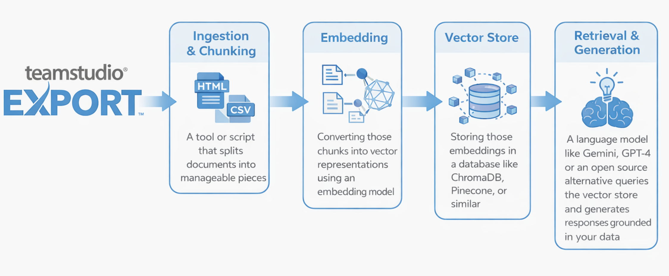 Teamstudio Export can produce several output formats, and they're not all equally suited to a RAG pipeline. Here's our thinking, though we'd genuinely welcome input from anyone who has tried this: